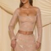 Sparkling separates. A perfect party piece. the Natala top is detailed with sparkling HOTFIX embellishments for endless sparkle. It’s cut from premium 20D stretch mesh to a figure-hugging silhouette. framed with a universally flattering square neck and long fitted sleeves. Create multiple looks by styling it with favourite jeans or the coordinating Nolene mini skirt.